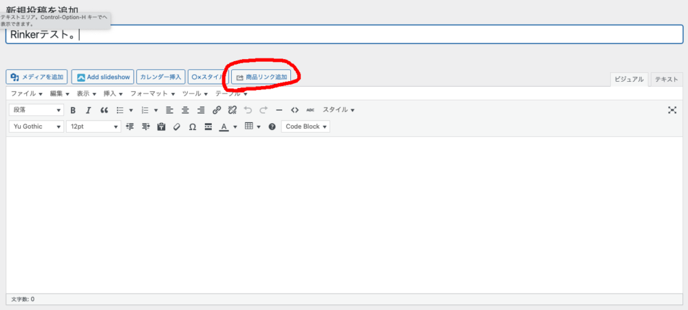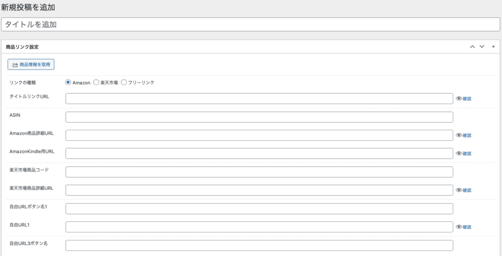 「商品リンクを追加」ボタンを押して商品リンクを作成します。