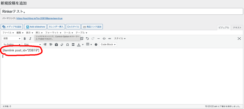 該当する商品の「商品リンクを追加」ボタンを押してショートコードを挿入します。