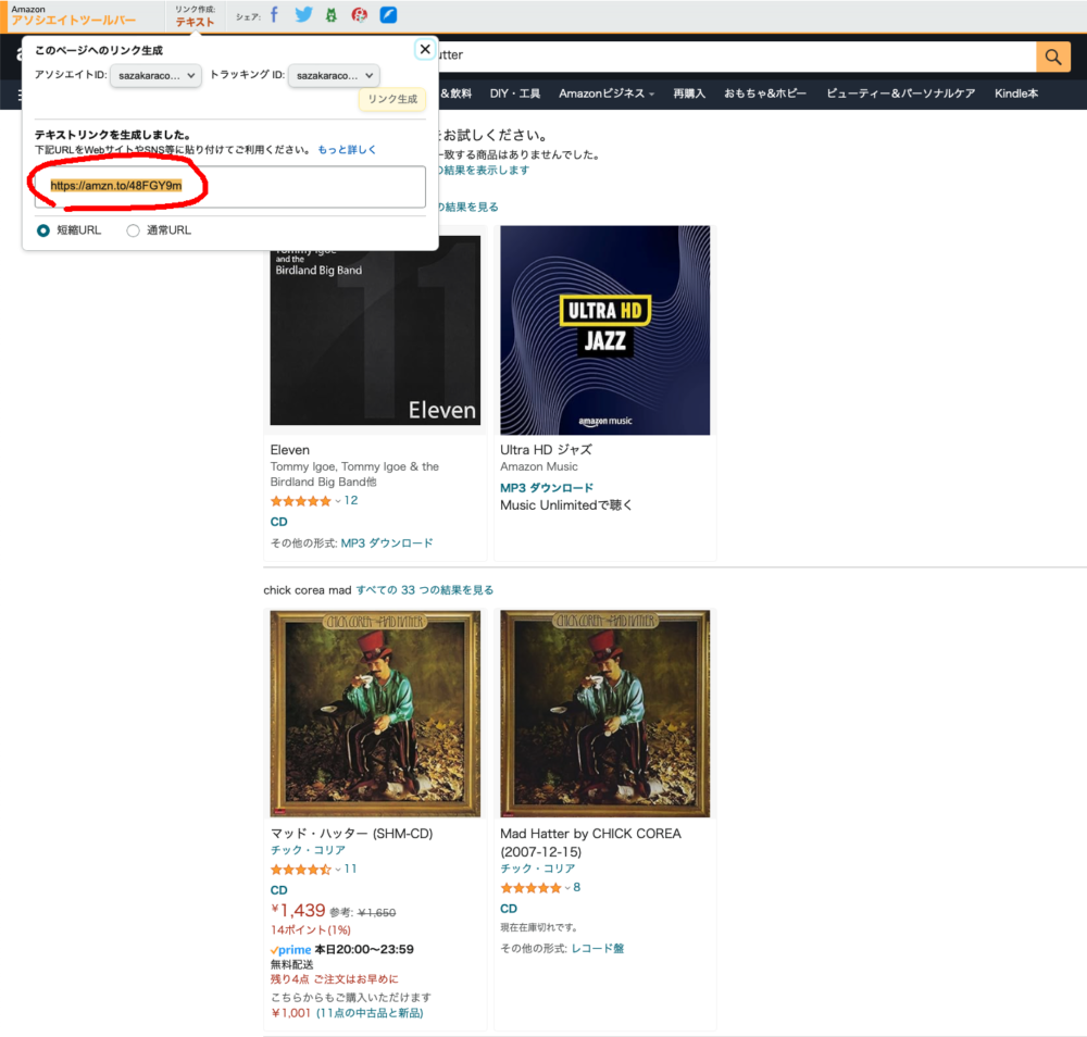 この場合、Amazonで検索すればAmazonのみ、楽天で検索すれば楽天のみのリンクが作成されるようです。ちょっと面倒ですね。