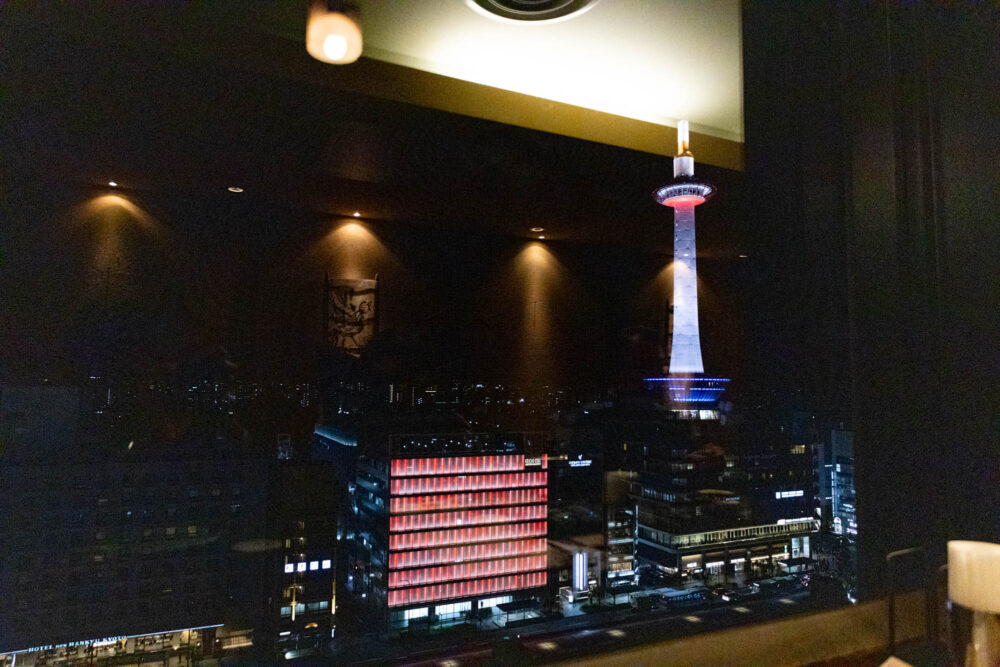 - 19時:ホテルチェックイン後に駅の伊勢丹9階「レストラン和楽」にて京都タワーを眺めながら晩飯。美味い。