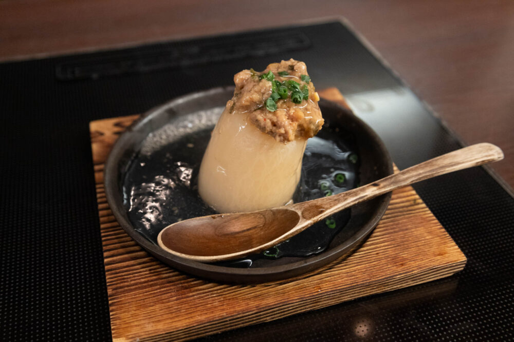 血の塊のようなコンニャクは、鉄分で赤くしているそうです。食感も強く、美味い。