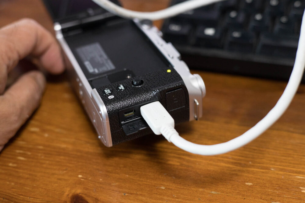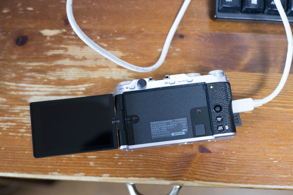 同梱のバッテリーは50%程度の残量でした。裏から見て右側の蓋を開け充電します。