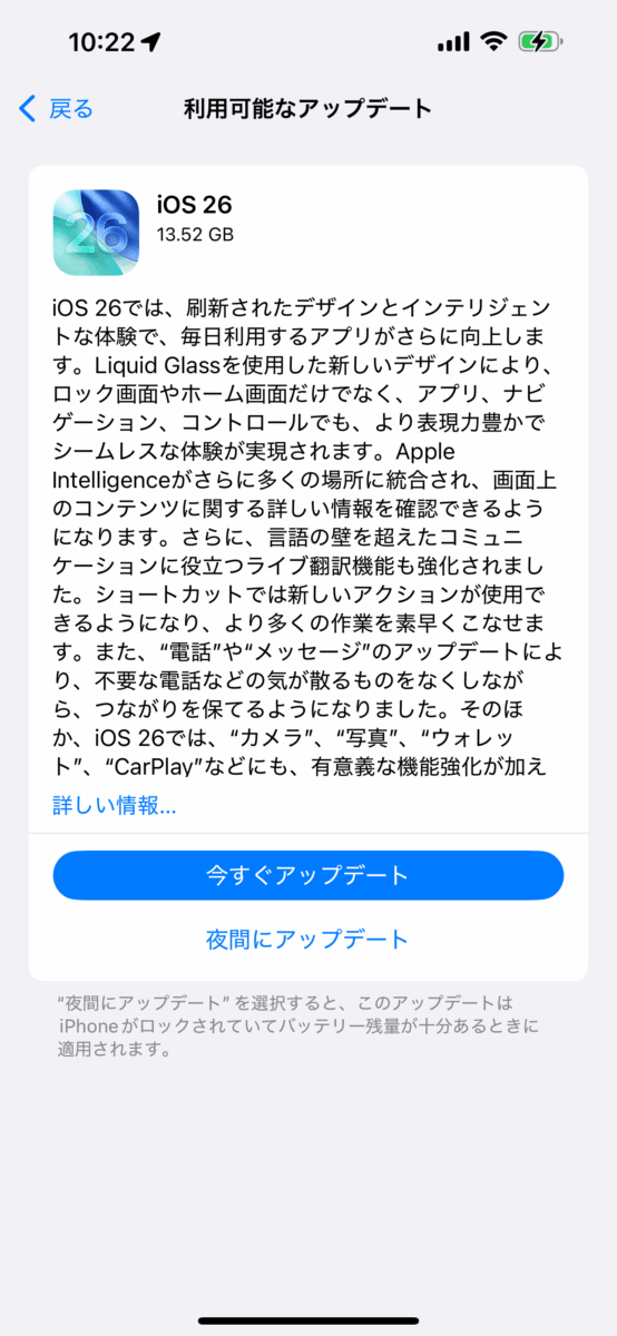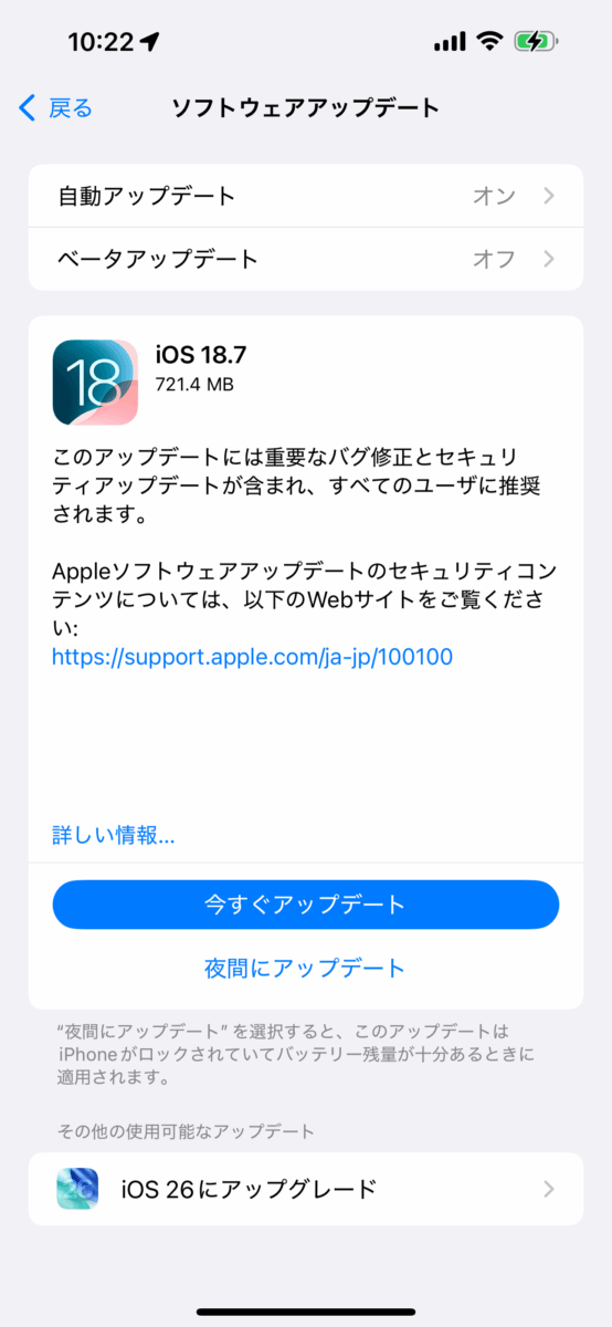 同時にiOS18.7がリリースされているため、アップデート画面はこう見えます。
