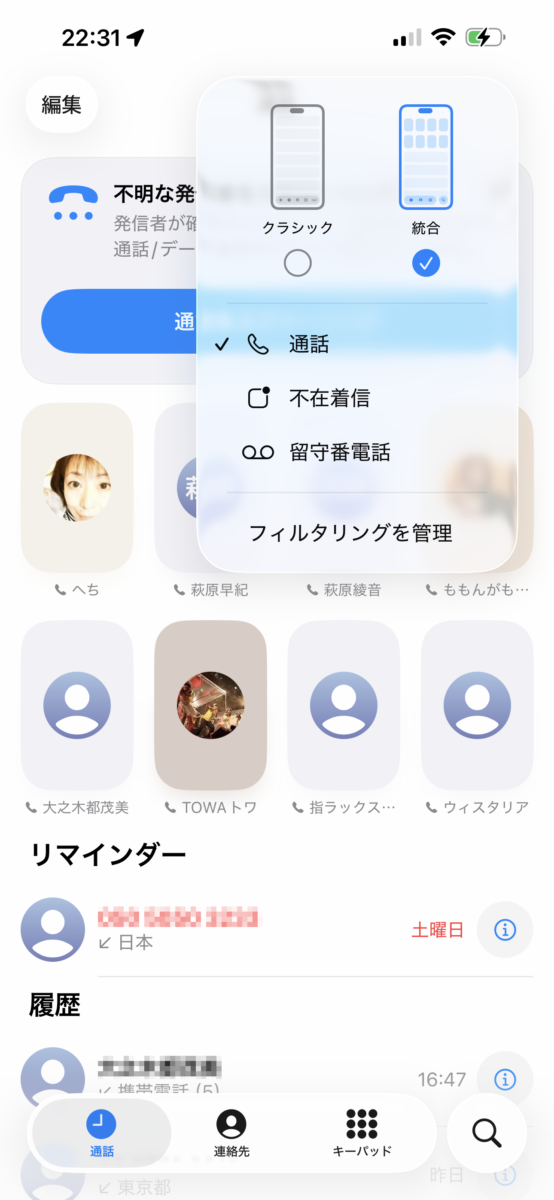 なお、統合ではなく「クラシック」画面も使えます。電話アプリ右上のハンバーガーメニュー(アンテナ強度のような)をタップすると切替設定画面が表示されます。