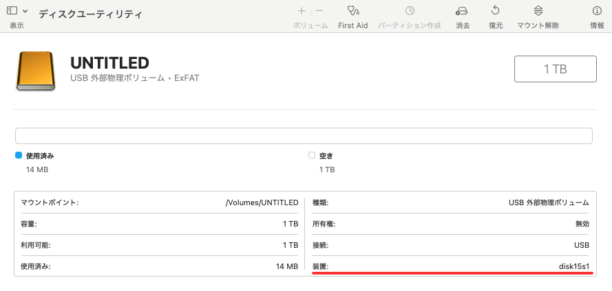 - 1TB SSDを接続し、ディスクユーティリティで「装置」を確認しておきます。ここではdisk15s1です。