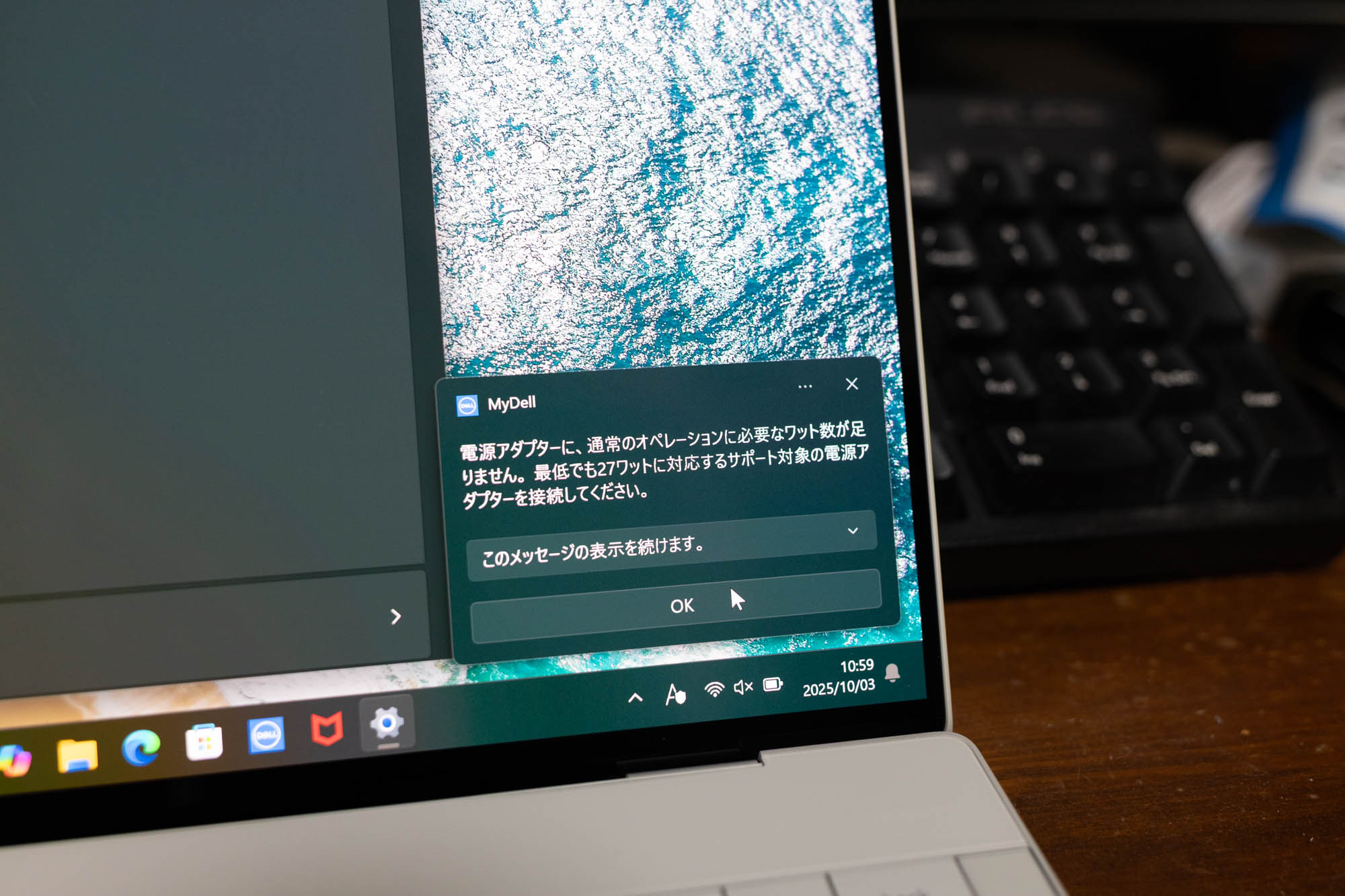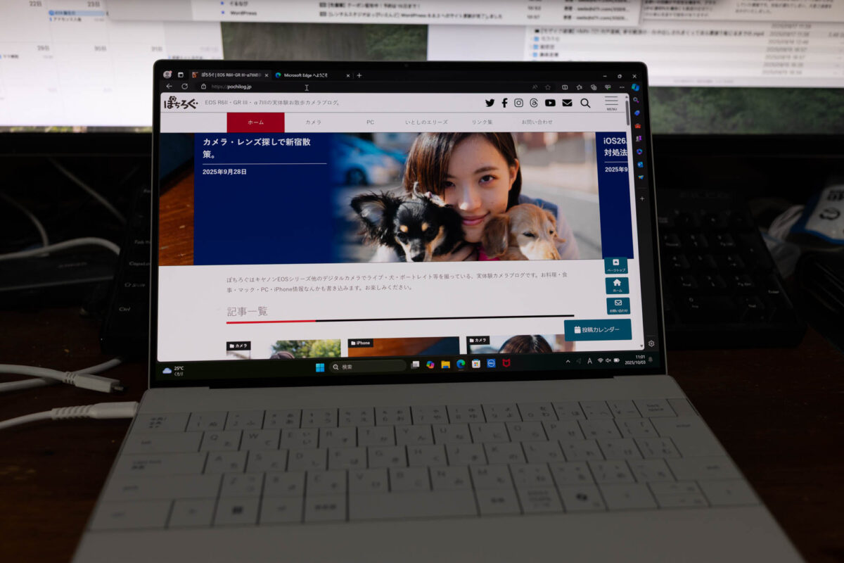 DELLで大好きなところは、電源供給がUSB-Cであること。最低27WのUSBアダプタが必要ですが、専用の電源アダプタよりもずっとスマートです。電源アダプタ無しで持ち出し、万が一バッテリー残量が低下しても、楽に充電が可能ですね。そもそも最大26時間駆動可能なので、よほどの心配性でなければアダプタを常時携行する必要はないでしょう。