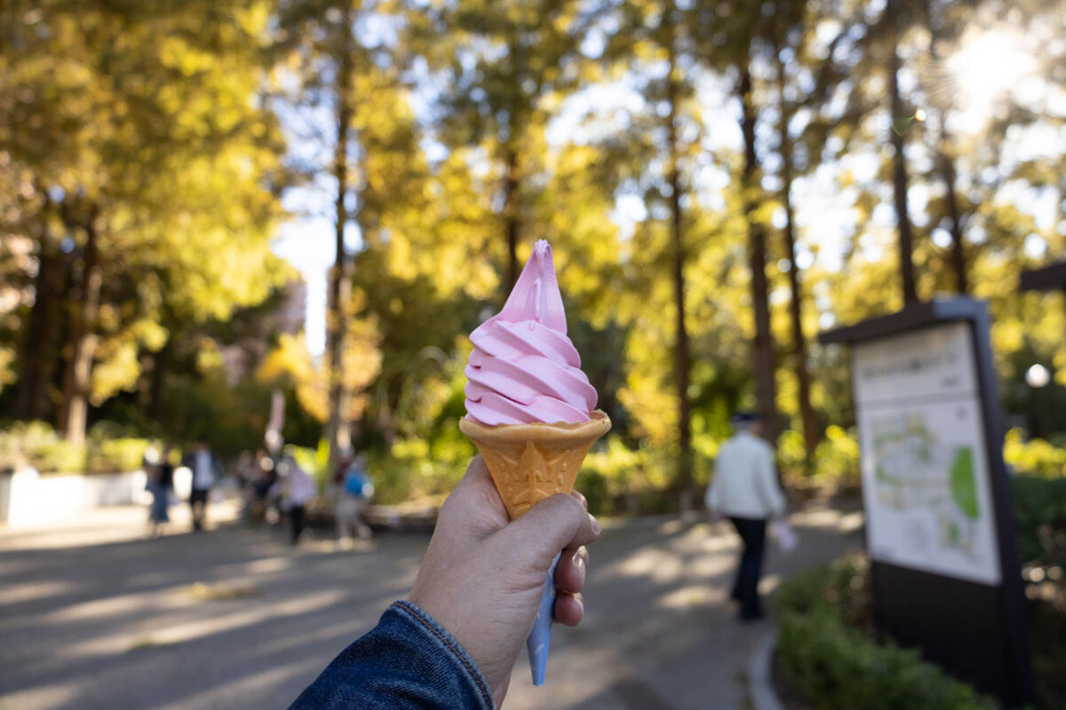 名物ローズソフトが食べられます(400円)。この日は木枯らし一号が吹くも、日当たりの良い場所で食べるソフトは「寒い〜」ということもなく美味しかったです。