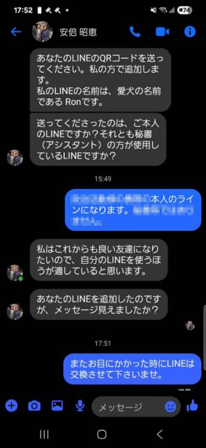「あなたのLINEのQRコードを送ってください。私の方で追加します。私のLINEの名前は、愛犬の名前であるRonです。」「あなたのLINEを追加したのですが、メッセージ見えましたか?」
