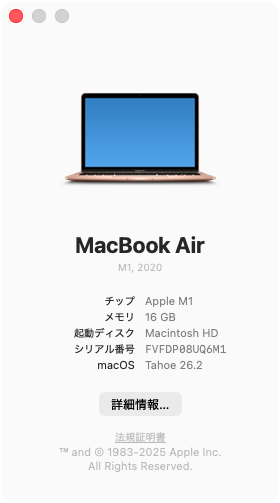 作業用マシンは「問題なければなるべく変更しない」が鉄則なのですが、MacOSのアップグレード通知をつい勘違いしてTahoe 26.2にしてしまいました。