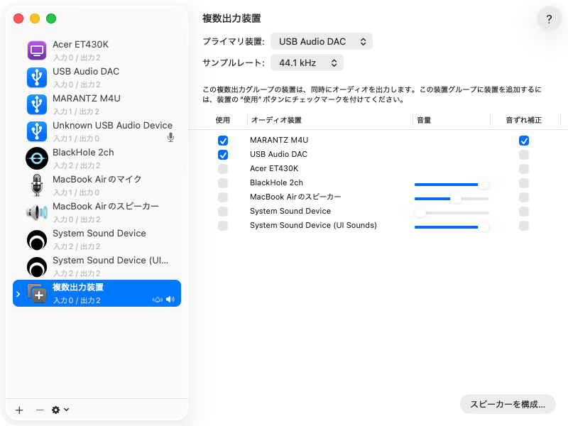 メインスピーカー+サブウーファーのように複数のアンプ/スピーカーを接続している場合、【アプリケーション】【ユーティリティ】【Audio MIDI設定.app】を使用して設定します。