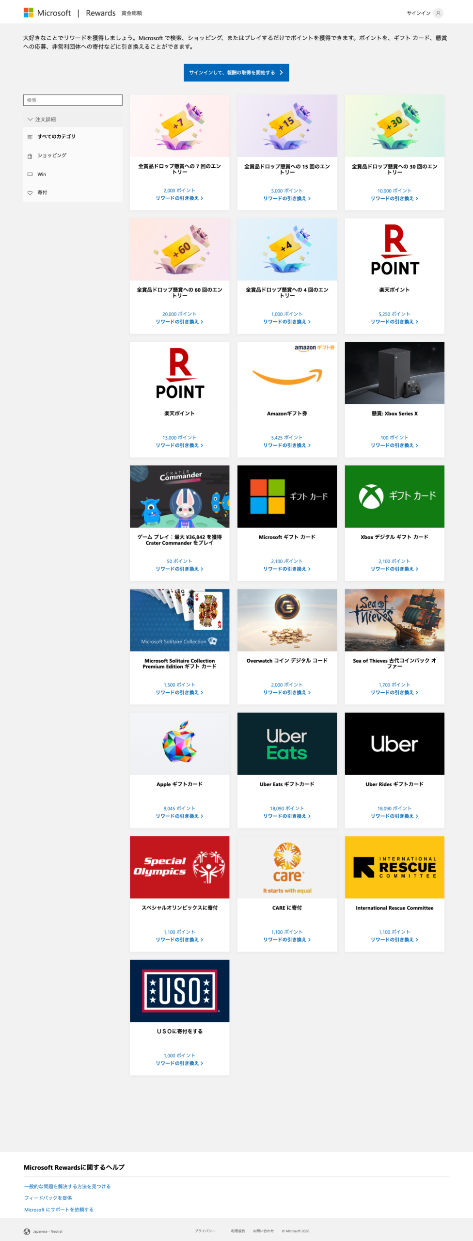 商品内容はサイトにアクセスしないと分からないのですが「ポイントを、ギフト カード、懸賞への応募、非営利団体への寄付などに引き換えることができます。」と書いてあります。つまり物品の賞品は無いのですね。