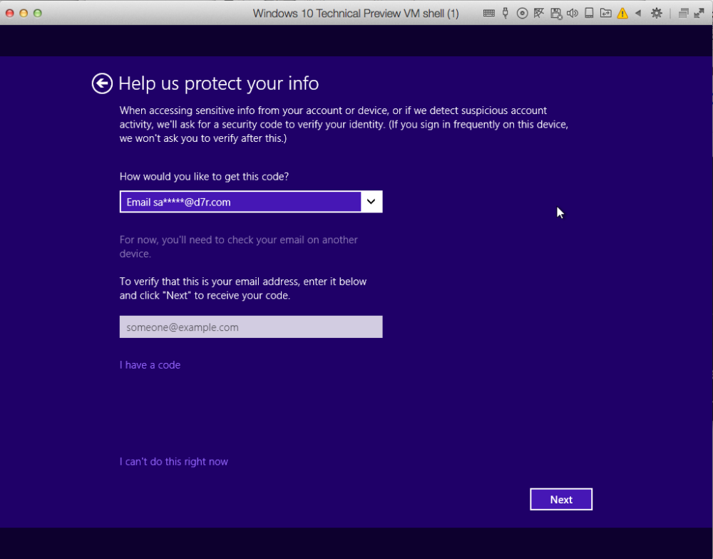 途中でセキュリティコードの表示方法を聞いてきます。メインマシンのOSを置き換えるわけではないので、E-Mailにすれば良いでしょう。